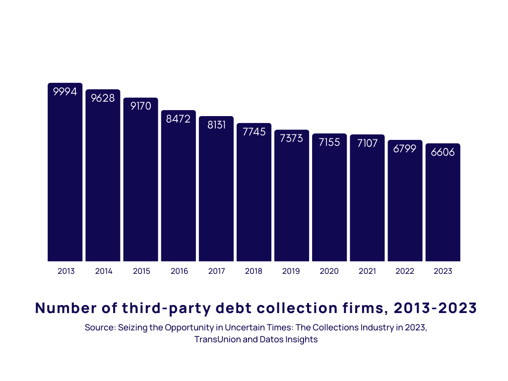 This size-based divide is particularly significant given the industry’s composition. In the US, approximately 73% of debt collection firms employ fewer than five employees. The industry is already experiencing consolidation, with the number of third-party collection firms declining 2.8% to 6,606 in 2023. This trend appears set to continue, with the Bureau of Labor Statistics projecting a 9% decline in jobs by 2033.